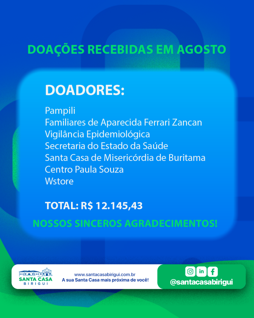 Agradecemos aos parceiros que fizeram doações ao hospital em agosto, por meio de alimentos, materiais hospitalares ou medicamentos, incluindo aqueles que preferem permanecer anônimos.